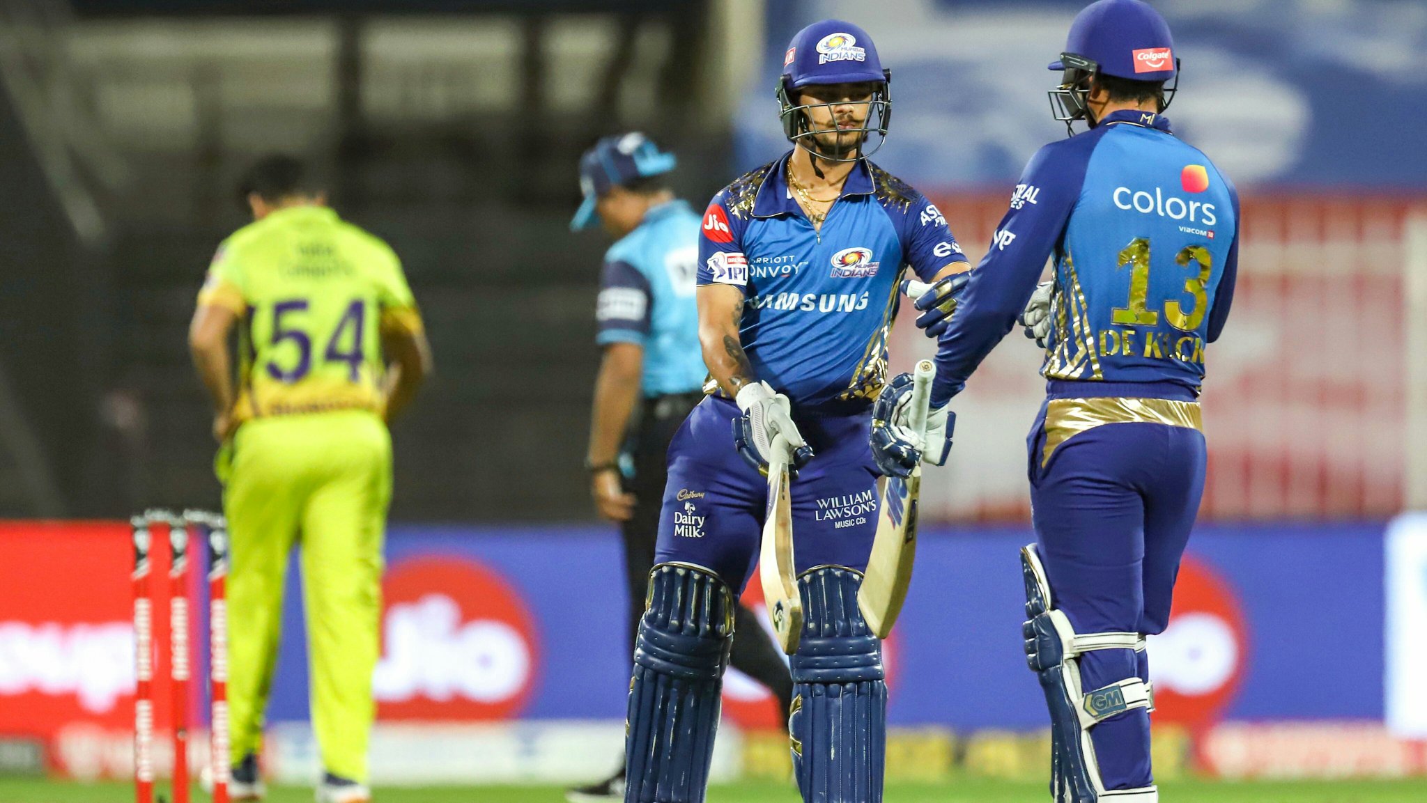 लक्ष्य के जवाब में मुंबई इंडियंस को ईशान किशन और क्विंटन डी कॉक ने जबरदस्त शुरुआत दी और पावरप्ले के 6 ओवर के बाद स्कोर 52/0 था और 11वें ओवर में ही मुंबई इंडियंस ने 100 का आंकड़ा पार कर लिया था। किशन ने सिर्फ 29 गेंदों में अपना अर्धशतक पूरा किया और 37 गेंदों में 6 चौके एवं 5 छक्कों की मदद से 68 रनों की धुआंधार पारी खेली। क्विंटन डी कॉक ने 37 गेंदों में 46 रनों का अहम योगदान दिया। दोनों बल्लेबाजों ने टीम को 13वें ओवर में 46 गेंद शेष रहते एक बेहतरीन जीत दिला दी। चेन्नई सुपरकिंग्स की 10 विकेट से यह आईपीएल में पहली हार है।