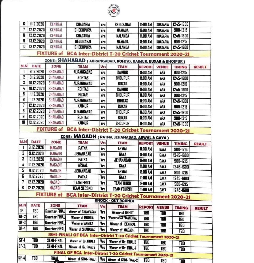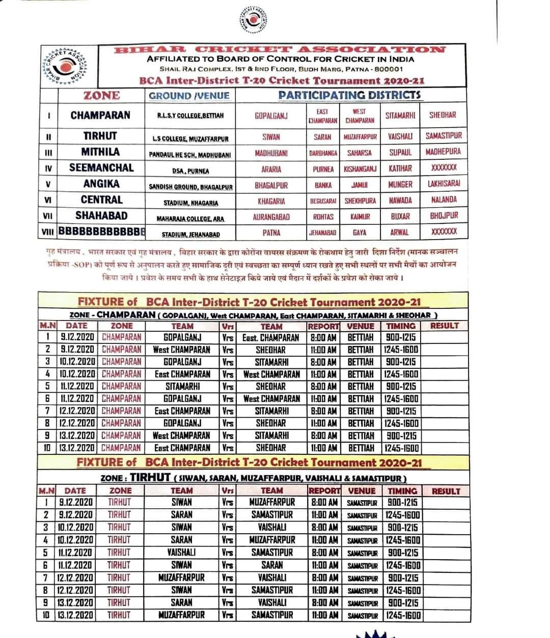 जो खबर मिल रही है उसके अनुसार आगामी 9 दिसंबर से बिहार क्रिकेट एसोसिएशन द्वारा बिहार के आठ जगहों पर इसके मैचों का आयोजन किया जायेगा। बिहार के 38 जिलों को आठ जोनों में बांट कर यह आयोजन किया जायेगा। मुकाबले बेतिया, समस्तीपुर, मधुबनी, पूर्णिया, भागलपुर, आरा, गया, खगड़िया या बेगूसराय में आयोजित किये जायेंगे।