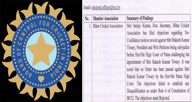 summary of Findings में कहा गया है कि बिहार क्रिकेट संघ के सचिव संजय कुमार ने एक आपत्ति जाहिर की है कि हाउस के द्वारा अविश्वास प्रस्ताव लाकर अध्यक्ष राकेश कुमार तिवारी को हटा दिया गया है। साथ ही पटना हाईकोर्ट में इन मामलों को लेकर केस दर्ज है। बीसीसीआई द्वारा जारी summary of Findings में कहा गया राकेश कुमार तिवारी के खिलाफ पटना हाईकोर्ट द्वारा अभी तक कोई ऑर्डर पास नहीं किया है इसीलिए नियम 6 के अनुसार सचिव की आपत्ति रद्द की जाती है।