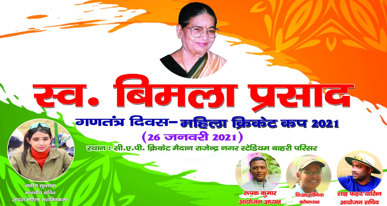 पटना:- गणतंत्र दिवस के मौके पर केंद्रीय विधि एवं न्याय, संचार और इलेक्ट्रॉनिक्स एवं सूचना प्रौद्योगिकी मंत्री की माता जी स्व.बिमला प्रसाद की स्मृति में होने वाले एकदिवसीय महिला क्रिकेट कप की सभी तैयारियां पूरी कर ली गई हैं। यह जानकारी सचिव डॉ नादिरा सुल्ताना ने दी।