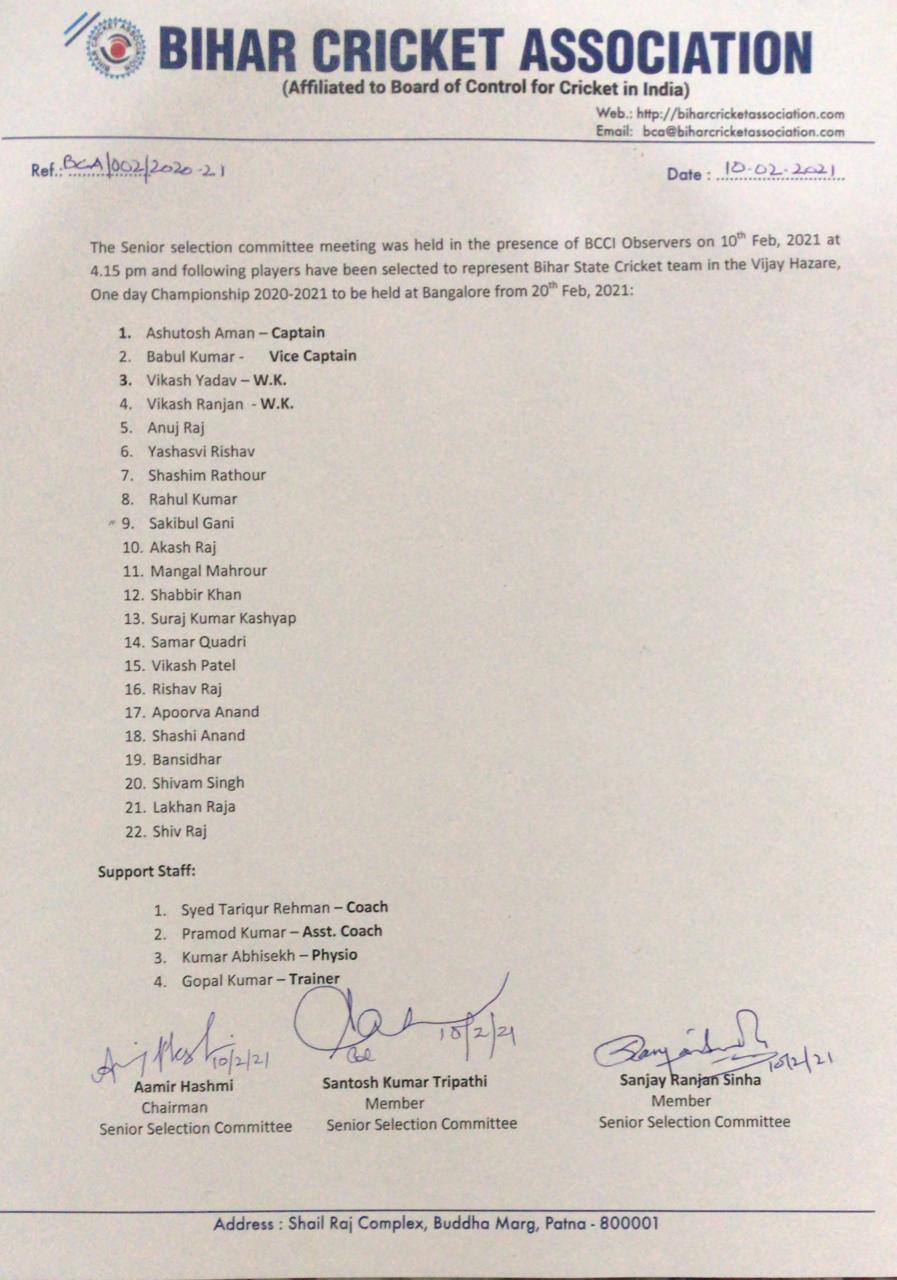 पटना:-  बीसीसीआई द्वारा आयोजित होने वाली विजय हजारे ट्रॉफी के लिए बिहार टीम की आधिकारिक घोषणा कर दी गई है।  बिहार क्रिकेट एसोसिएशन के वेबसाइट पर बिहार के टीम की घोषणा की जा चुकी है जिसमे कई नए चेहरे से साथ पुराने चहरे भी मौजूद है। टीम की कमान आशुतोष अमन को सौंपी गई है। टीम में कुल 22 खिलाड़ियों को शामिल किया गया है।