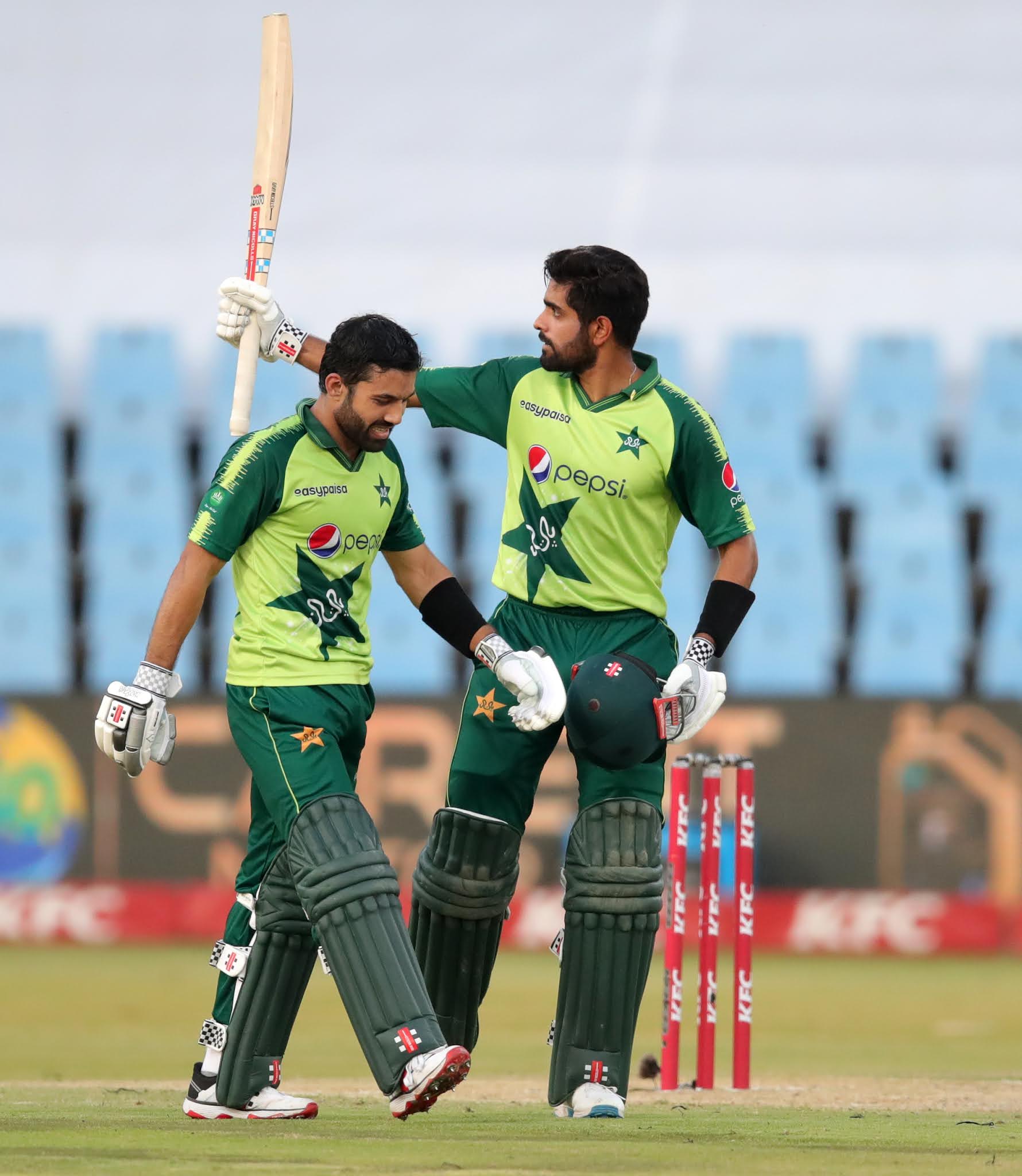 लक्ष्य के जवाब में बाबर आज़म और मोहम्मद रिज़वान ने टीम को जबरदस्त शुरुआत दी और पहले विकेट के लिए रिकॉर्ड 197 रन जोड़ डाले। बाबर आज़म ने सिर्फ 49 गेंदों में अपना शतक पूरा किया और पाकिस्तान की तरफ से शतक लगाने वाले सिर्फ तीसरे बल्लेबाज बने। साथ ही उन्होंने पाकिस्तान की तरफ से सबसे तेज़ टी20 शतक का रिकॉर्ड भी बनाया। आज़म ने 122 रनों की अपनी पारी में 15 चौके और 4 छक्के लगाये। 18वें ओवर में 197 के स्कोर पर वह लिजाड विलियम्स की गेंद पर आउट हुए।
