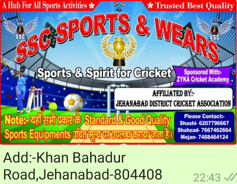 वही एसएससी स्पोर्ट्स वियर जो इस टूर्नामेंट में प्रयोजक की भूमिका निभाई है। खान बहादुर रोड, जहानाबाद में एसएससी स्पोर्ट्स शॉप ने भी इस टूर्नामेंट को करवाने में मुख्य भूमिका निभाई।