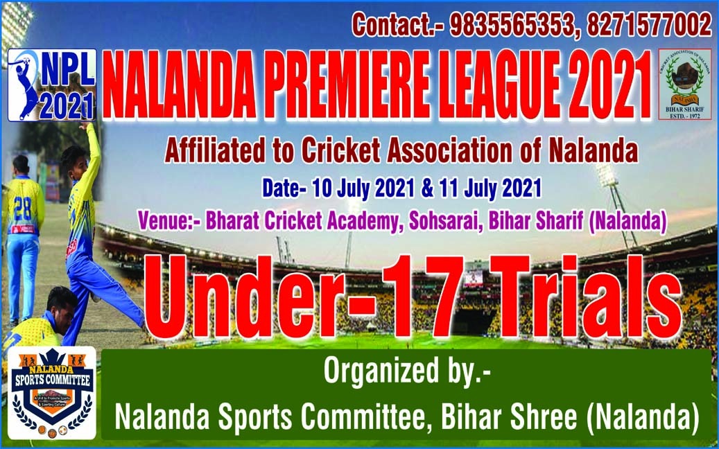 क्रिकेट संघ नालंदा से मान्यता प्राप्त नालंदा प्रीमियर लीग का आयोजन नालंदा स्पोर्ट्स कमिटी के द्वारा किया जा रहा है। नालंदा स्पोर्ट्स कमिटी के चेयरमैन ज्ञान सागर ने बताया कि आगामी 10 और 11 जुलाई को ट्रायल का आयोजन किया जा रहा है। उन्होंने बताया कि नालंदा प्रीमियर लीग अंडर-17 के ट्रायल में पूरे बिहार का खिलाड़ी भाग ले सकता है।