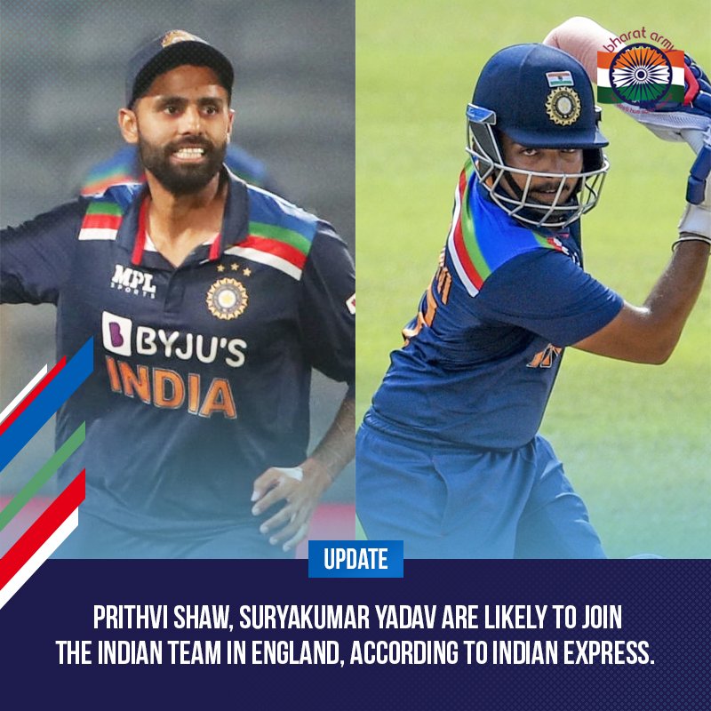 पता चला है कि सूर्यकुमार और शॉ के नामों को चेतन शर्मा की अगुवाई वाली चयन समिति ने मुख्य कोच रवि शास्त्री के साथ चर्चा के बाद तय किया था। एक तीसरे खिलाड़ी के लिए भी कथित तौर पर अनुरोध किया गया था, लेकिन इस बात की कोई जानकारी नहीं है कि किसी अन्य खिलाड़ी को इंग्लैंड भेजा जाएगा या नहीं।