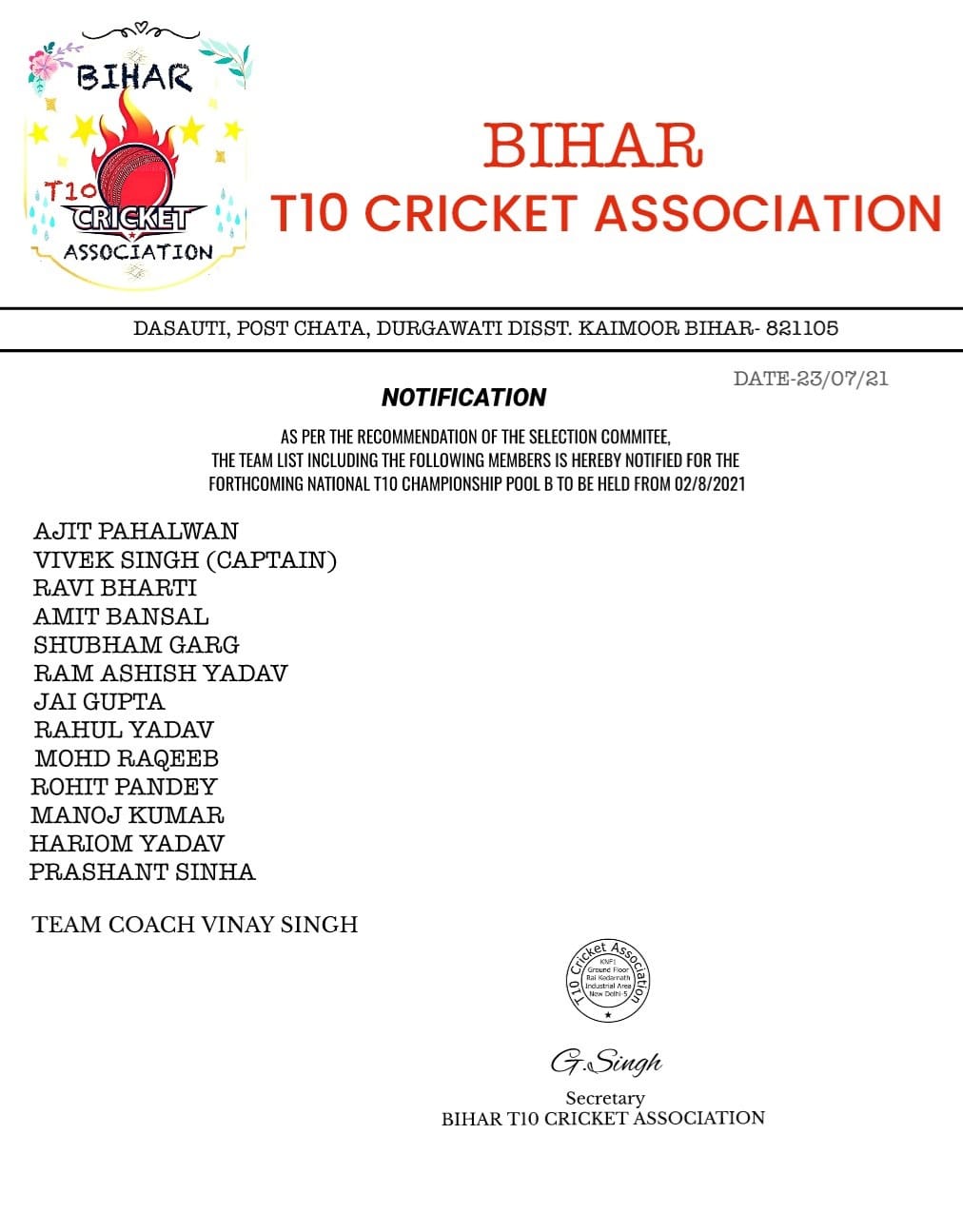 बिहार टी-10 एसोसिएशन के सचिव गुड्डू सिंह ने बताया कि बिहार के टीम कप्तान विवेक सिंह के अलावा अजित पहलवान, रवि भारती, अमित बंसल, शुभम गर्ग, जय गुप्ता, राहुल यादव, राम आशीष यादव, मो.राकिब, रोहित पांडेय, मनोज कुमार, हरिओम यादव, और प्रशांत सिन्हा का चयन किया गया। वही टीम का कोच विनय सिंह को नियुक्त किया गया है। बिहार की टीम 1 अगस्त को नोएडा के लिए रवाना होगी।