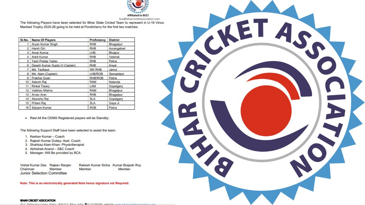 पटना: बिहार क्रिकेट एसोसिएशन (BCA) ने आगामी अंडर-19 वीनू मांकड़ ट्रॉफी 2025-26 के लिए बिहार राज्य क्रिकेट टीम की घोषणा की है। यह टूर्नामेंट पुडुचेरी में आयोजित किया जाएगा, जहां बिहार टीम अपने पहले दो मुकाबले खेलेगी। घोषित टीम में राज्य के विभिन्न जिलों से 16 खिलाड़ियों को शामिल किया गया है। समस्तीपुर के मोहम्मद आलम को टीम का कप्तान बनाया गया है, जबकि अरवल के दिपेश कुमार गुप्ता उपकप्तान की जिम्मेदारी निभाएंगे।