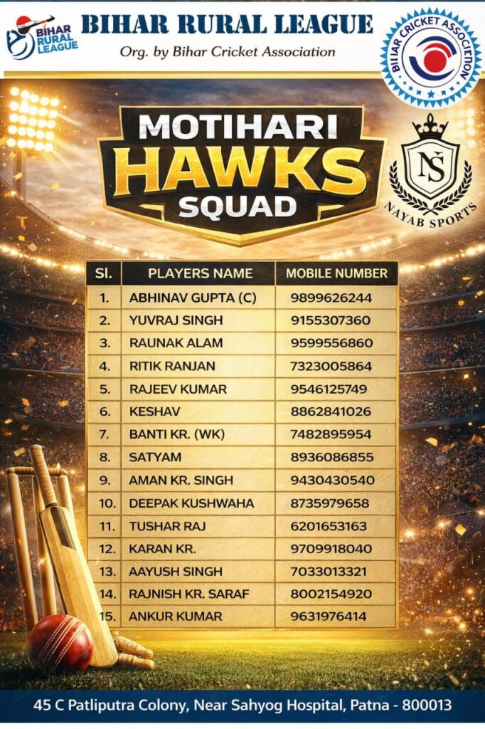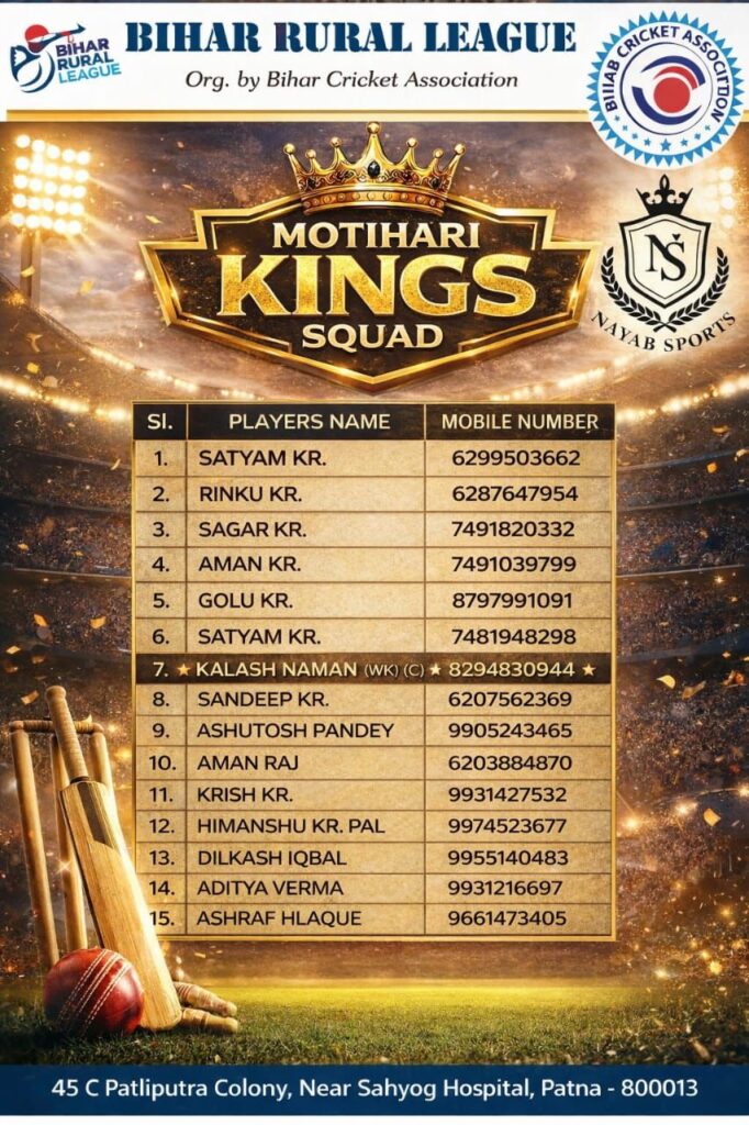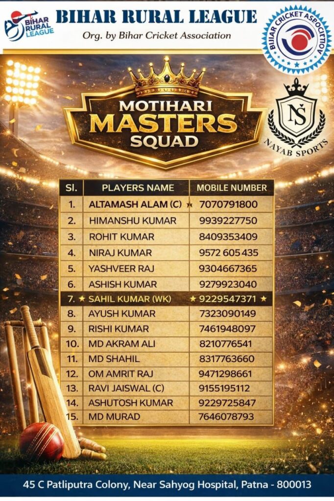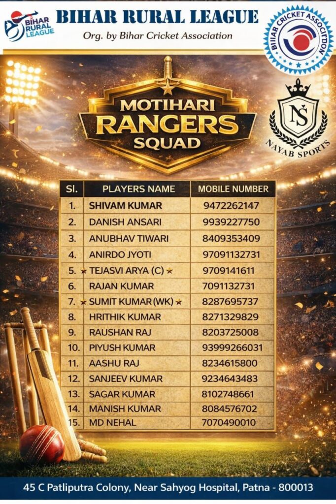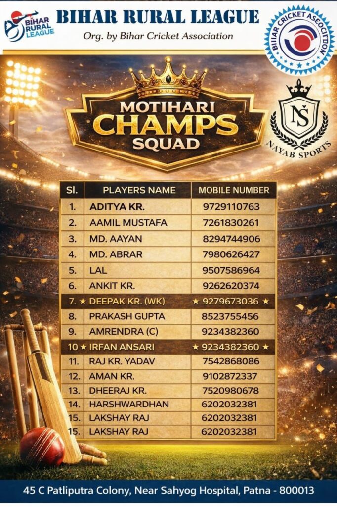 उन्होंने बताया कि शेष 11 टीमों की घोषणा एक सप्ताह के भीतर कर दी जाएगी। इस प्रकार मोतिहारी ज़िले से कुल 16 टीमें बिहार रूरल लीग में भाग लेंगी, जो जिले के ग्रामीण क्रिकेट के लिए एक बड़ी उपलब्धि मानी जा रही है।